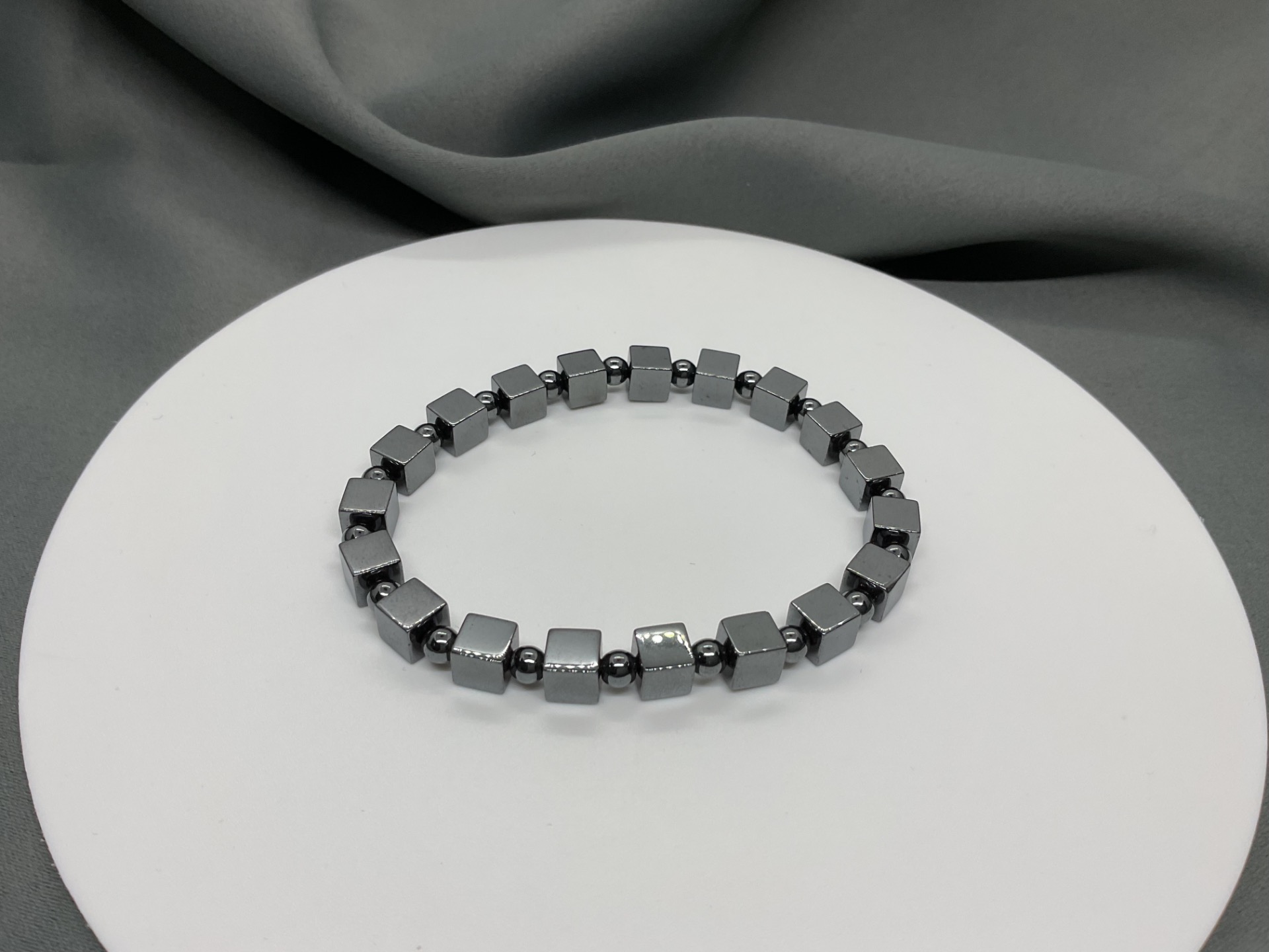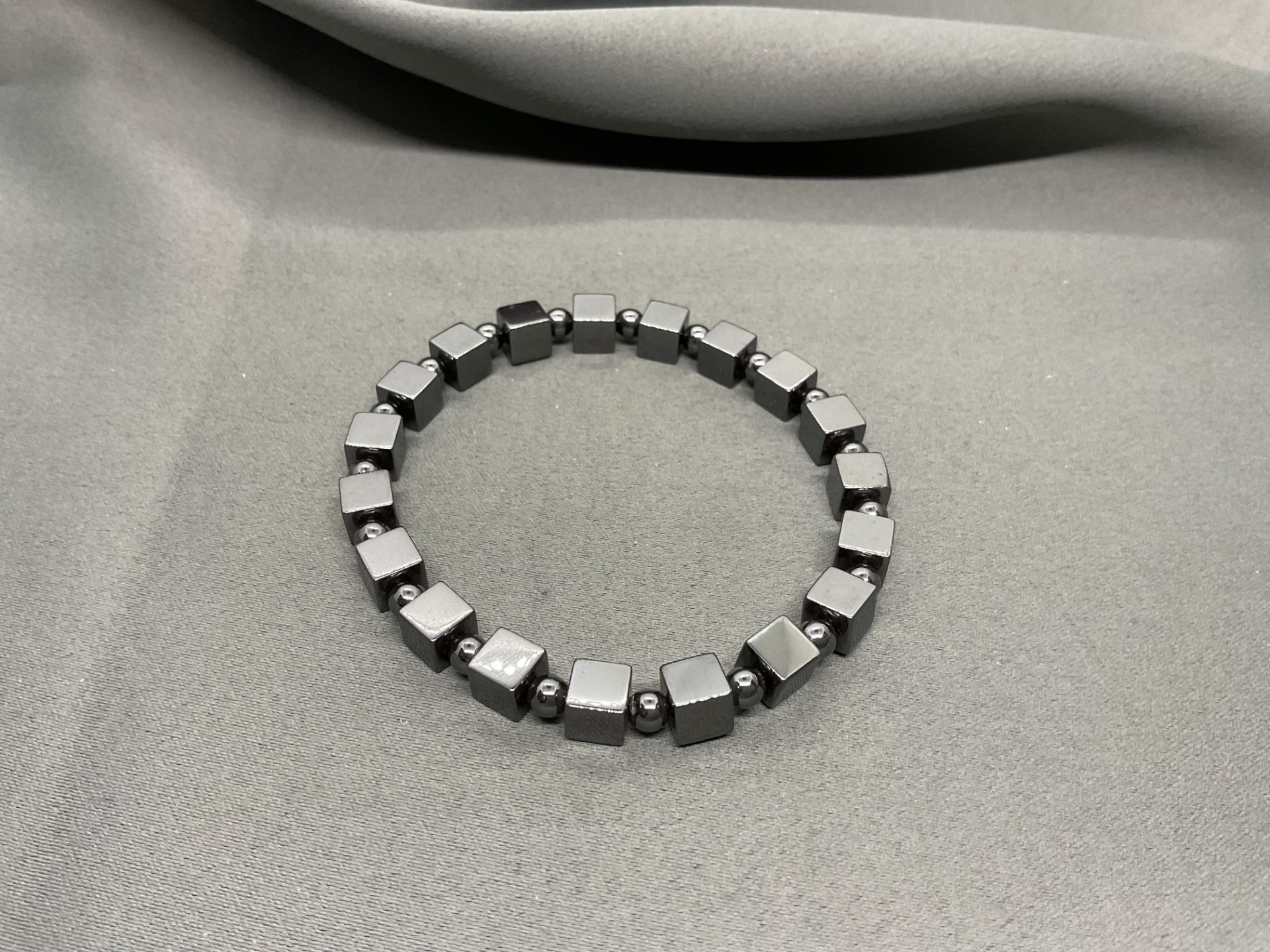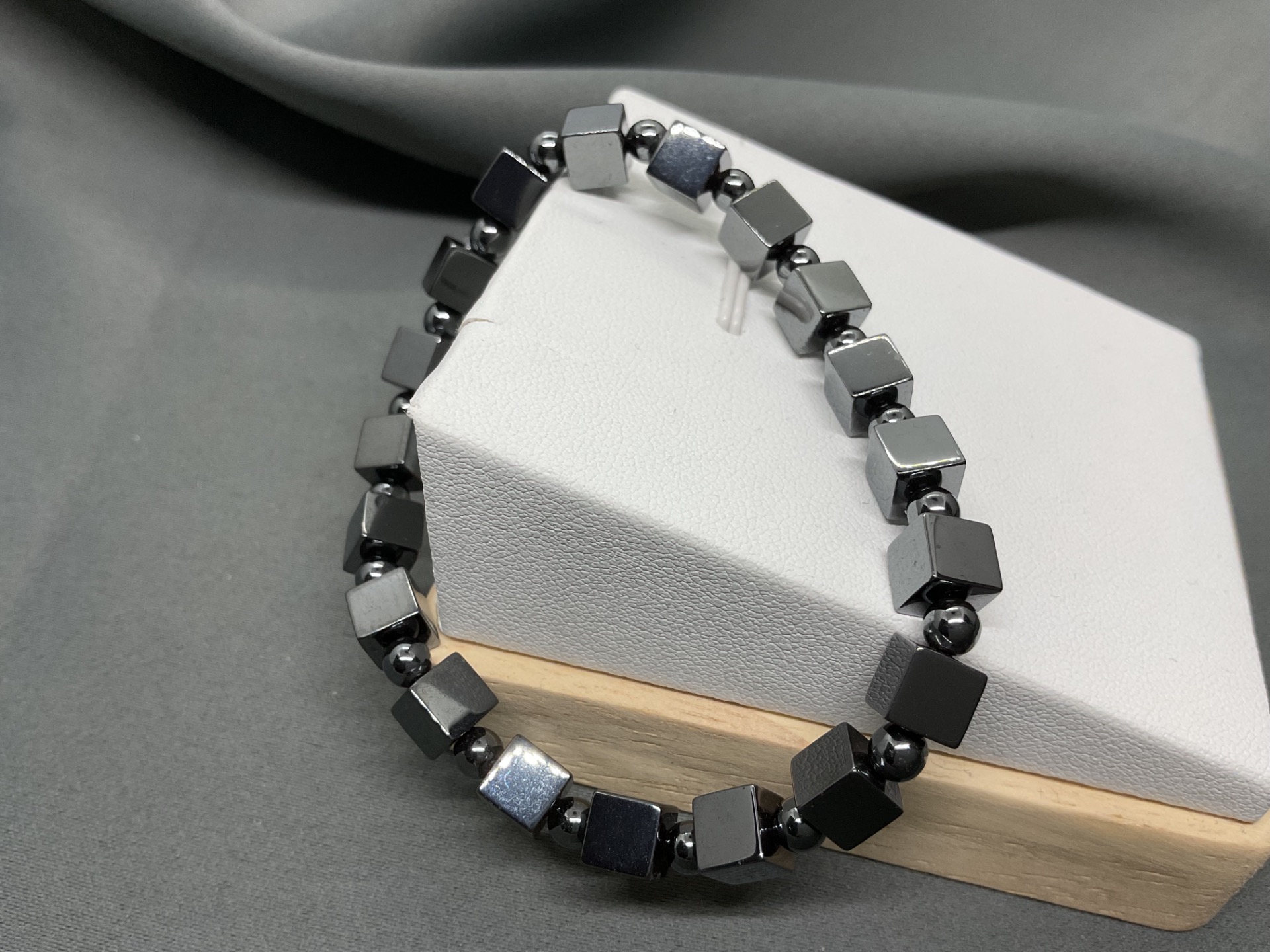 Adaugă un plus de forță și stil ținutelor tale zilnice cu această brățară unică, realizată din hematit natural. Designul său geometric, ce alternează cuburi lustruite cu mici sfere metalice, oferă un aspect modern, minimalist și sofisticat. Hematitul, cunoscut și sub numele de "piatra minții", impresionează prin culoarea sa gri-metalic, asemănătoare oțelului, și prin reflexiile sale oglindă. Această brățară nu este doar un accesoriu chic, ci și un instrument puternic pentru echilibrarea energiei și ancorarea în prezent.