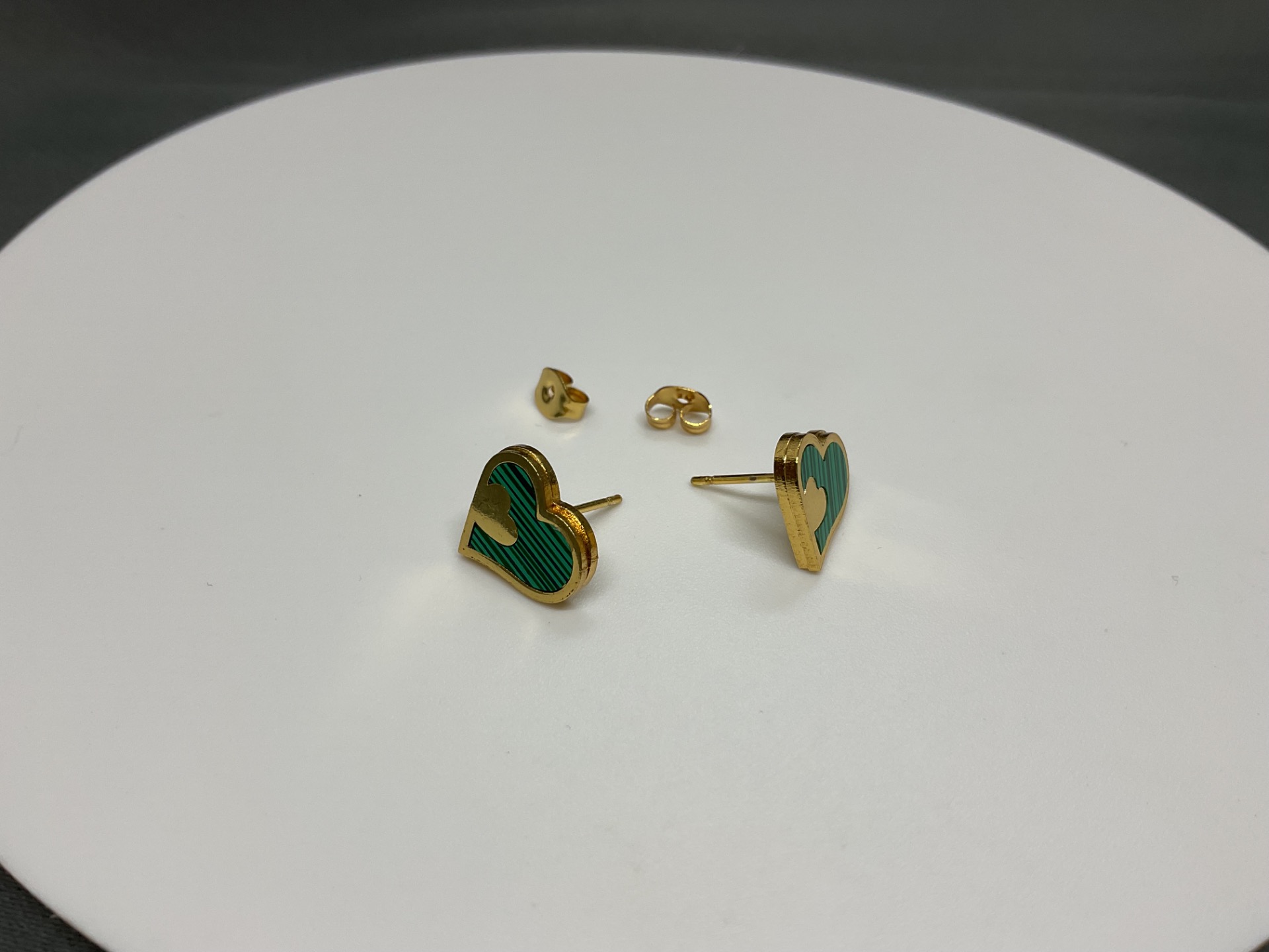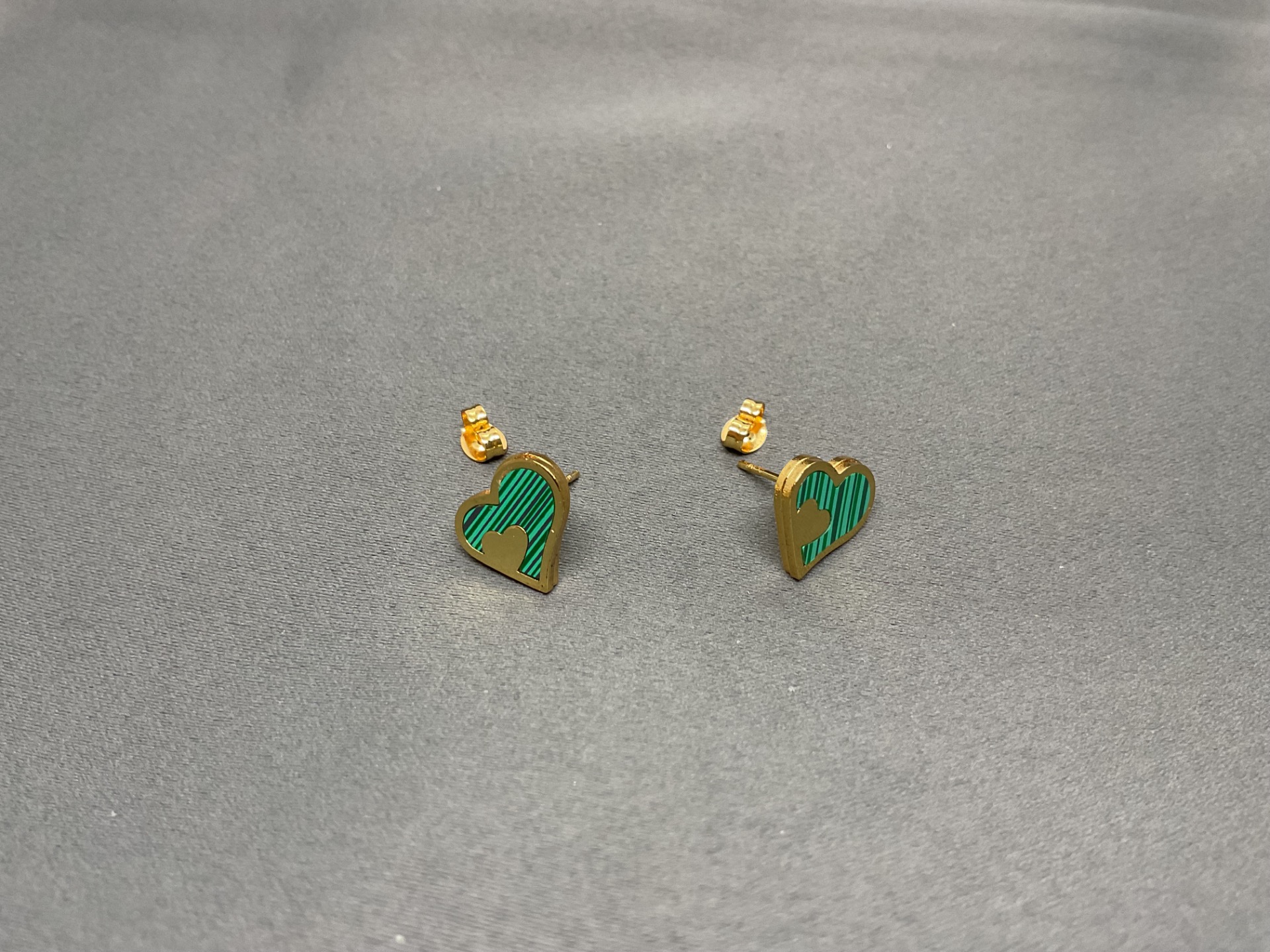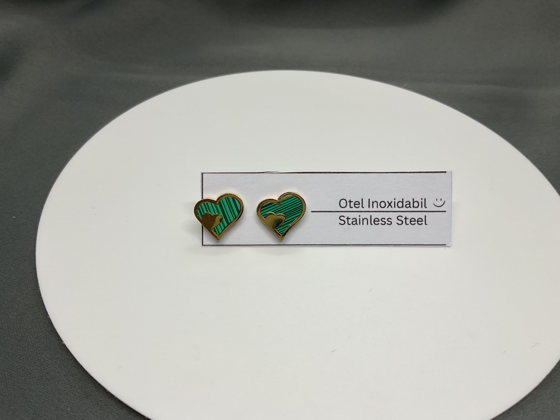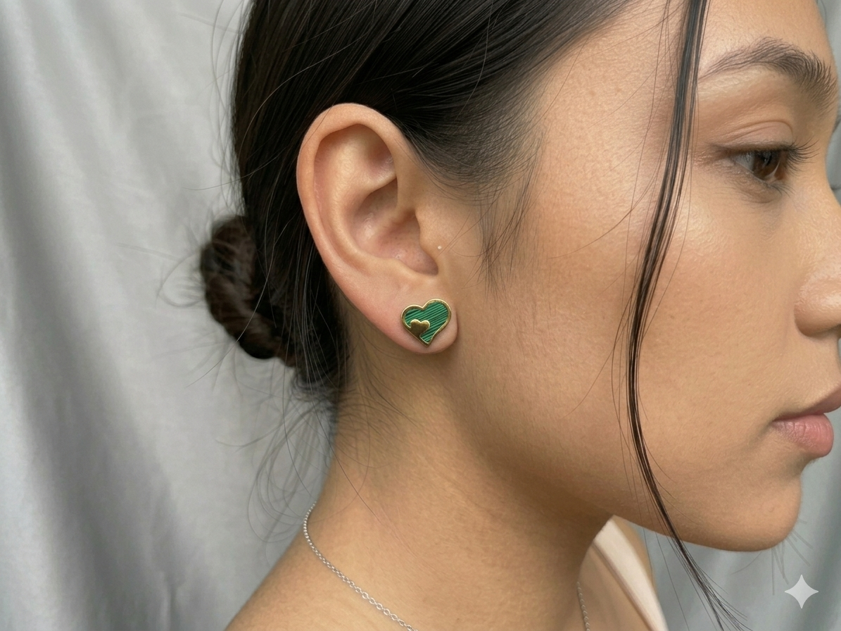 Exprimă-ți iubirea și stilul unic cu acești cercei fascinanți în formă de inimă. Designul lor ingenios prezintă o inimă mare cu un model liniar în nuanțe de verde smarald, decorată cu o mică inimă aurie în relief, creând un efect vizual 3D deosebit. Este o bijuterie care îmbină farmecul vintage cu execuția modernă, fiind perfectă pentru a adăuga o pată de culoare și rafinament oricărei ținute.