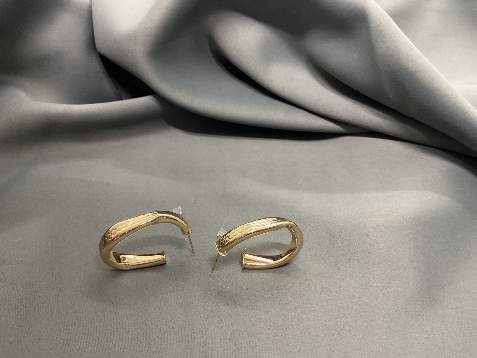 Iesi din anonimat cu o pereche de cercei care imbina formele organice cu finisajele artizanale. Acesti cercei de tip veriga ovala (hoops) surprind prin textura lor speciala, "ciocanita", care reflecta lumina in multiple directii, oferind o stralucire sofisticata. Designul lor curbat si modern ii face sa fie piesa centrala a oricarei tinute elegante sau casual-chic.