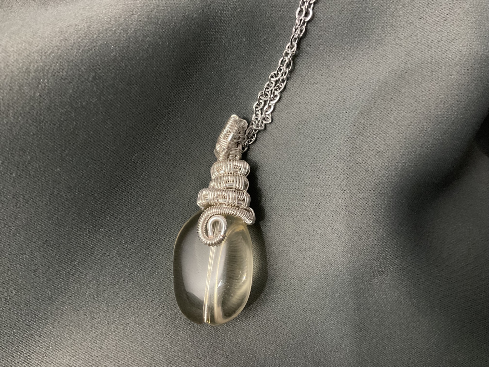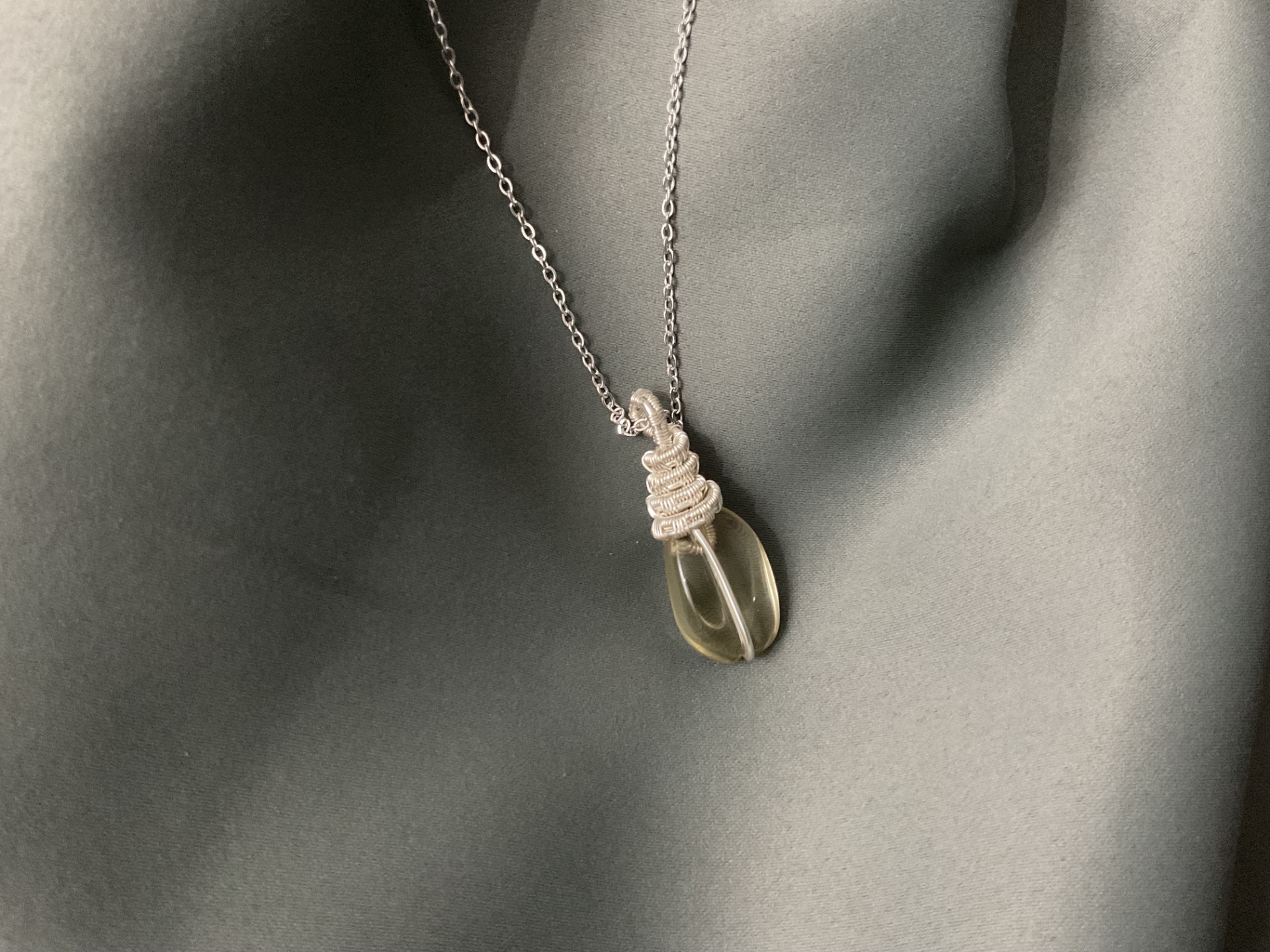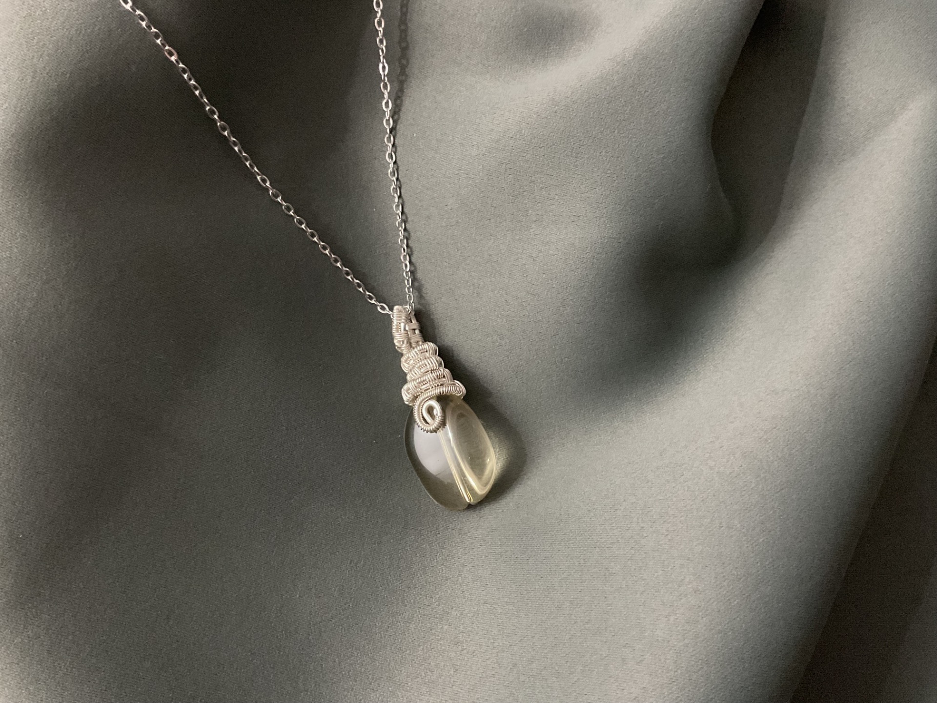 Colier handmade elegant, realizat cu atenție la fiecare detaliu, ce îmbină rafinamentul designului artizanal cu strălucirea subtilă a pietrelor naturale. Pandantivul este confecționat din sârmă de cupru suflată cu argint, modelată manual într-un design delicat și armonios.