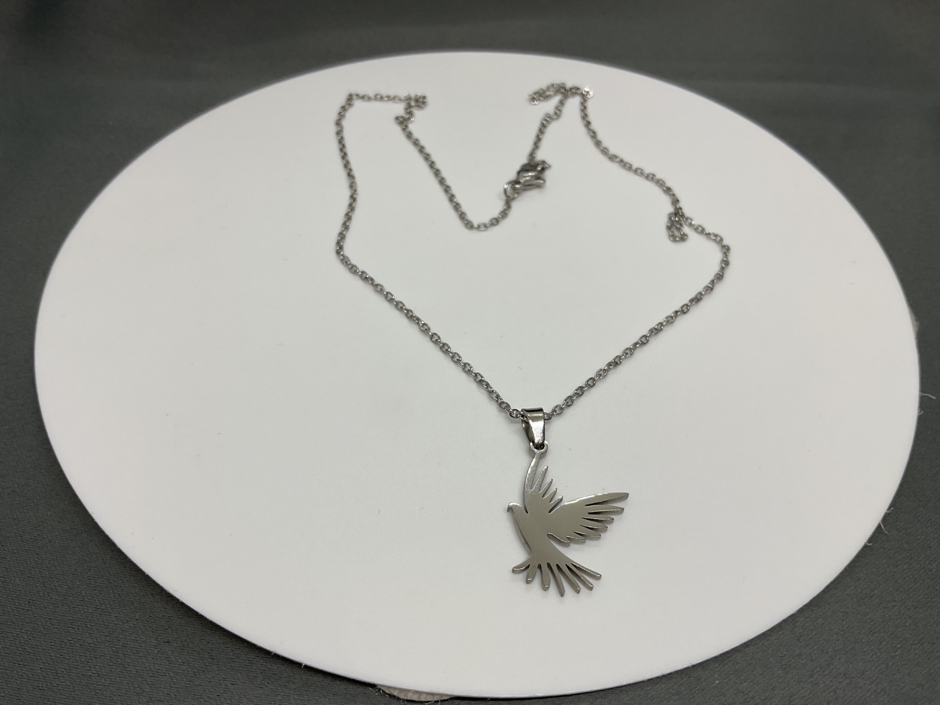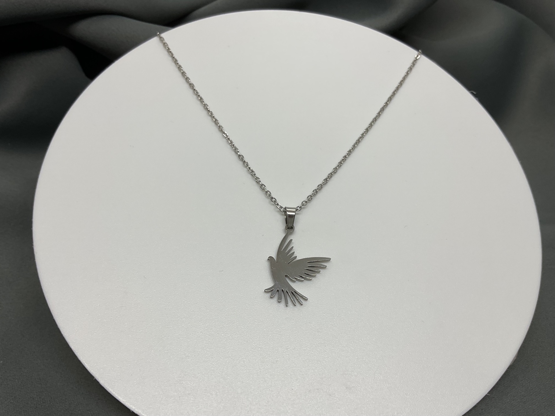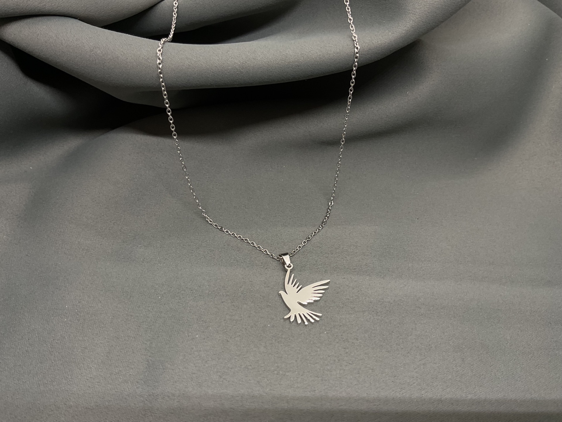 Poartă un simbol al armoniei interioare cu acest colier deosebit, ce redă silueta unei porumbițe în plin zbor. Detaliile aripilor sunt lucrate cu precizie, oferind pandantivului un aspect aerodinamic și contemporan. Este o piesă cu o estetică curată, ideală pentru cei care apreciază bijuteriile cu mesaj și design minimalist, fiind ușor de integrat în orice stil vestimentar.
