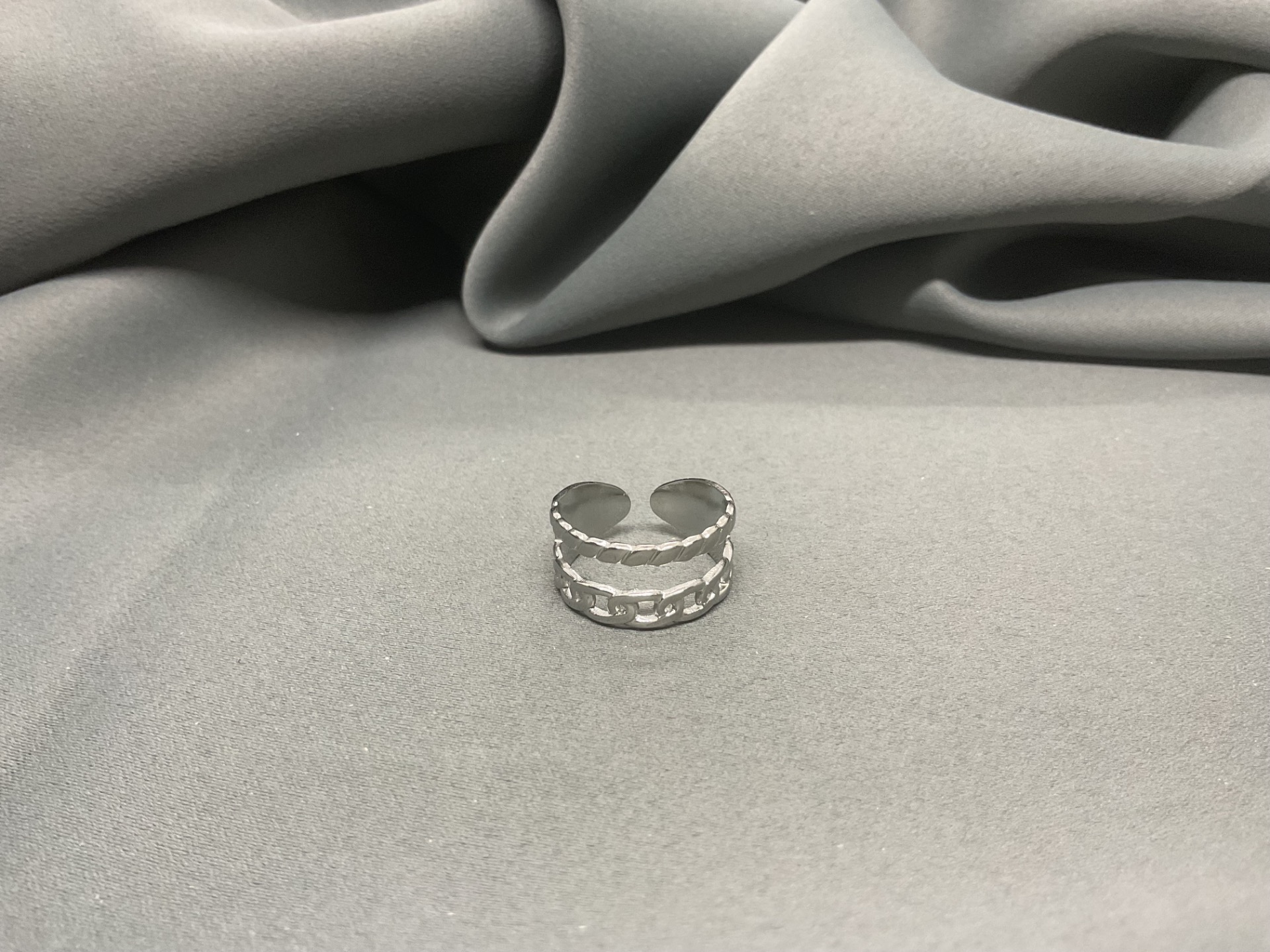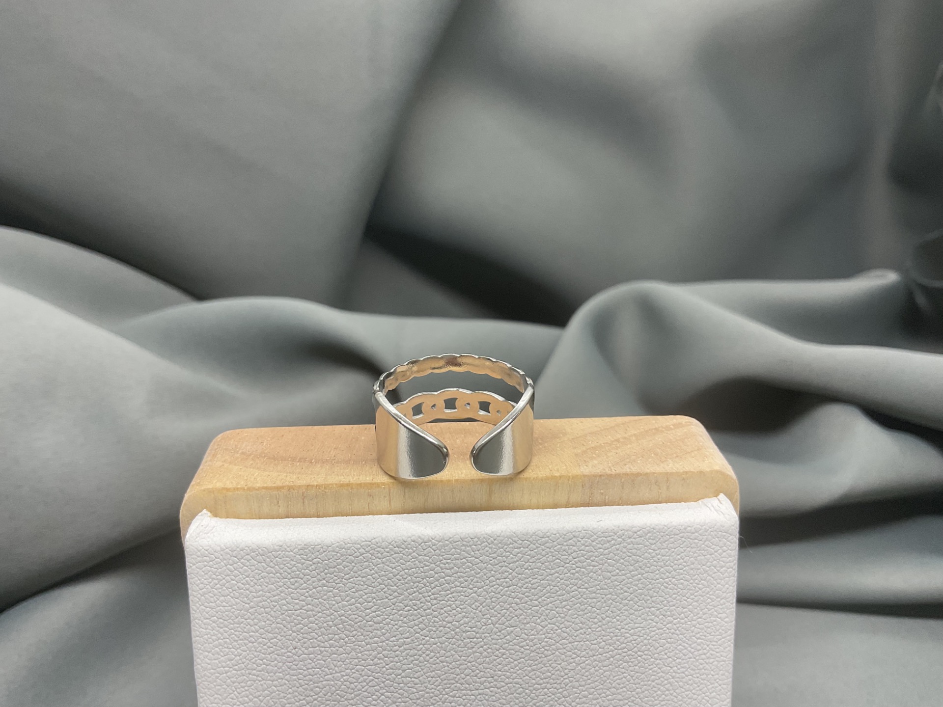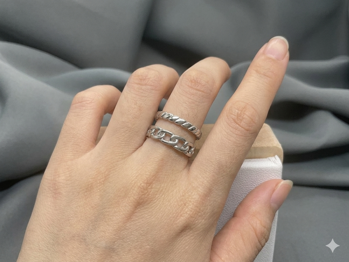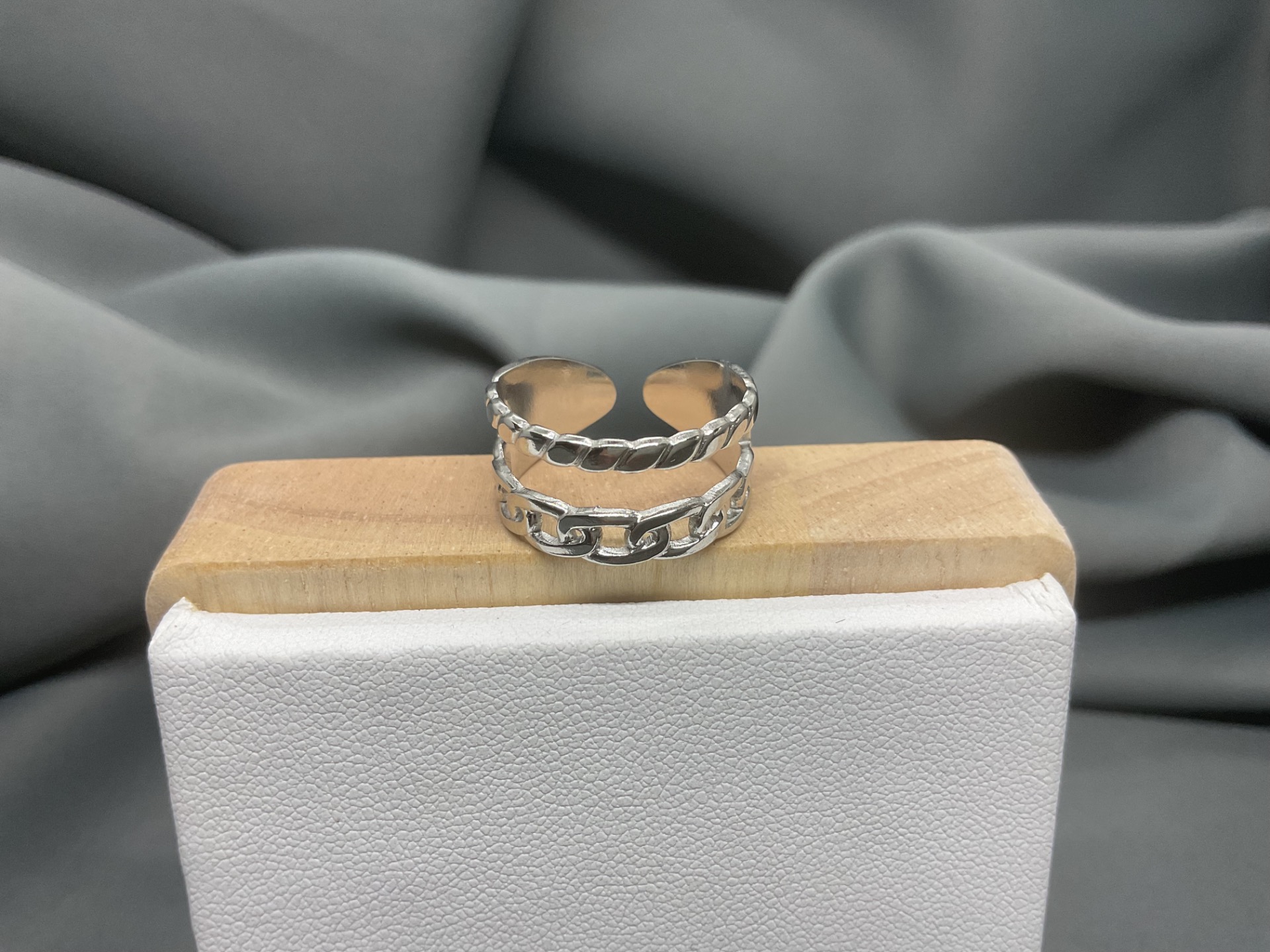 Un design îndrăzneț care oferă aspectul de "stacking" (două inele purtate simultan) într-o singură piesă confortabilă. Acest inel îmbină o bandă cu textură răsucită și un rând de zale tip lanț pentru un look modern și urban.