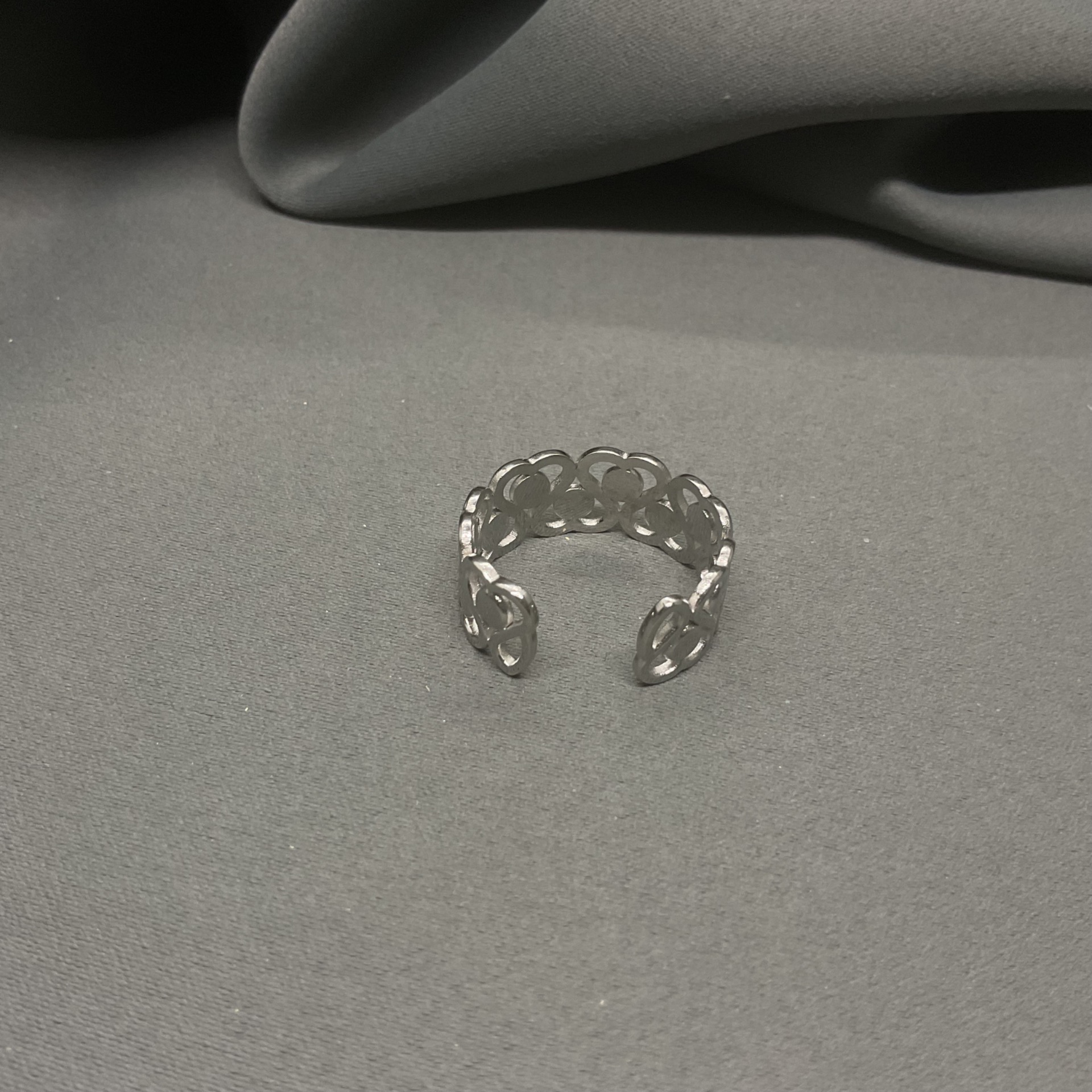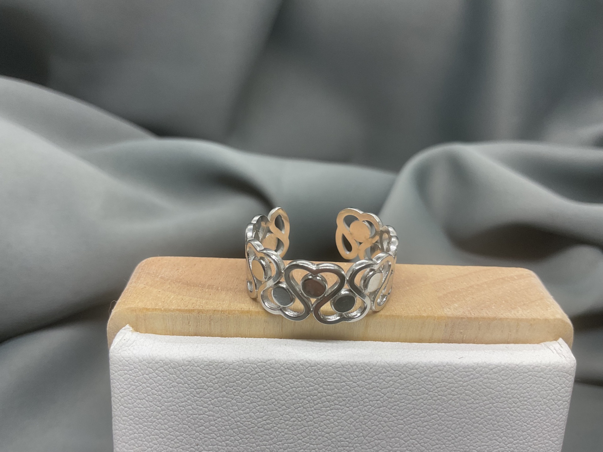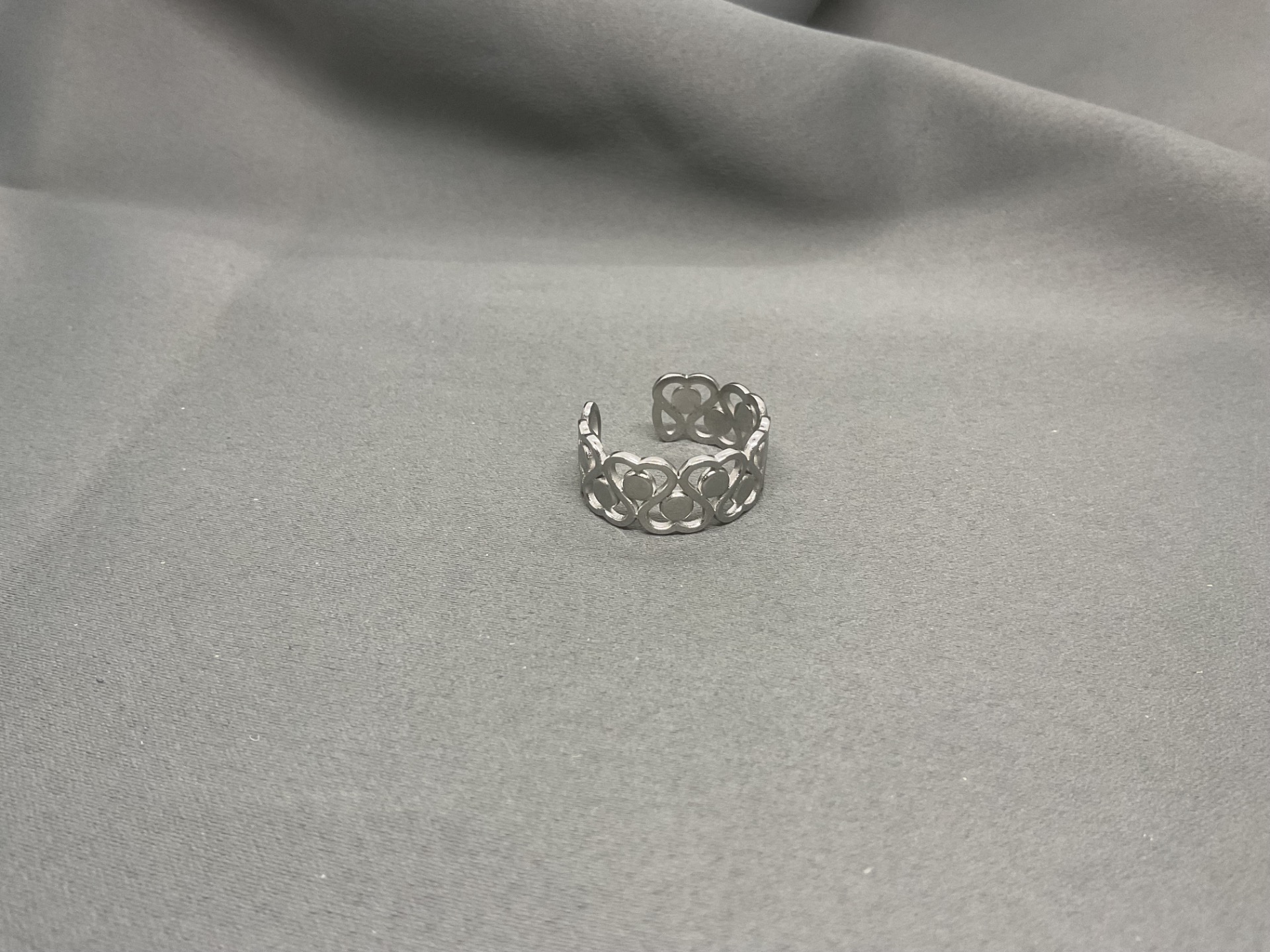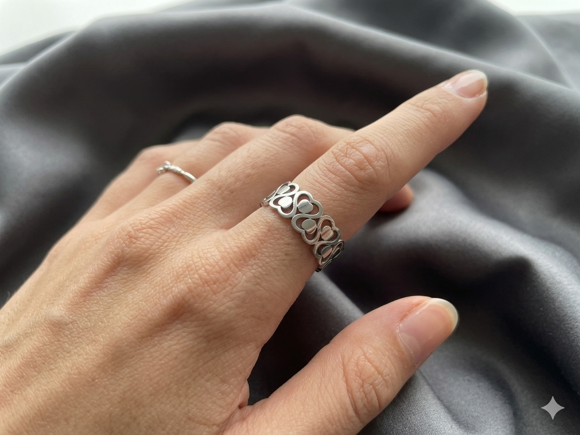 Exprimă-ți stilul romantic cu acest inel fermecător, decorat cu un șir continuu de inimioare stilizate. Realizat cu o atenție deosebită la detalii, designul său de tip "open band" (deschis) permite ajustarea ușoară pe orice deget, oferindu-ți flexibilitatea de a-l purta pe degete diferite în funcție de stare sau ocazie. Este o piesă ușoară, confortabilă și plină de simbolism, reprezentând iubirea infinită și conexiunile prețioase din viața ta.